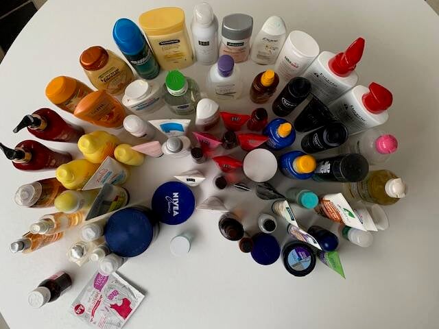 Tijd om je badkamer eens op te schonen want hoeveel flesjes , potjes en tubes heb jij?